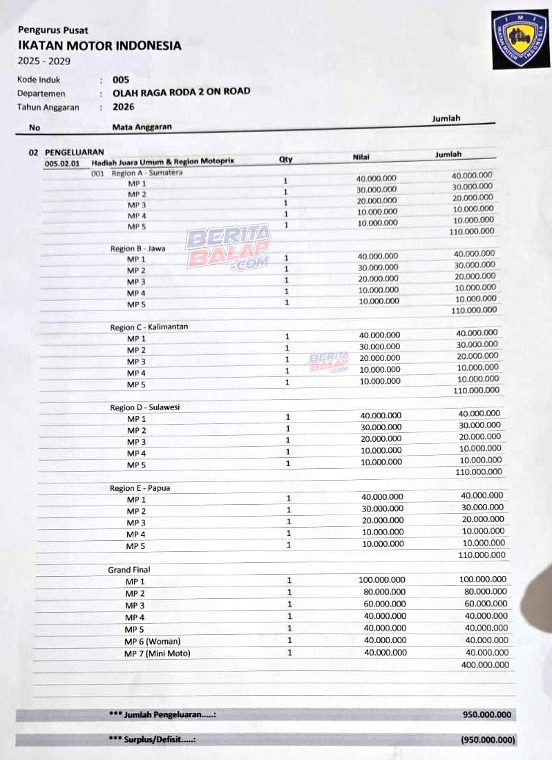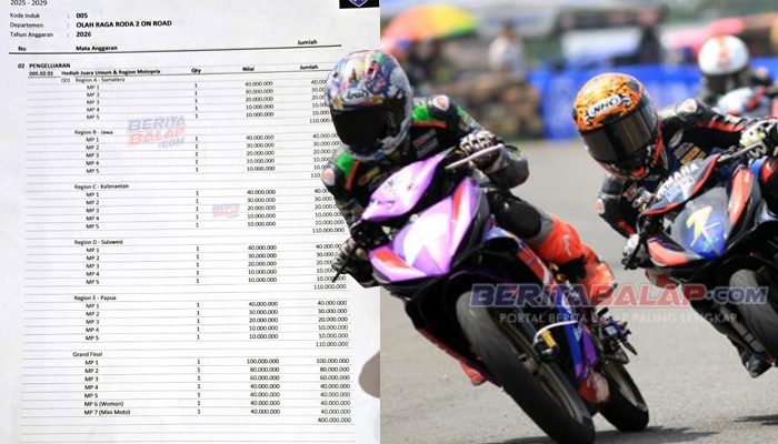BeritaBalap.com- MANTAP Punya ! Kejurnas MotoPrix 2026 menyiapkan total hadiah hampir 1 Milyar. Tepatnya 950 juta. Mantap. Sejarah spesial. Jadi ini total ya dimana dibagi untuk tiap region dan juga ketika Grand Final MotoPrix 2026.